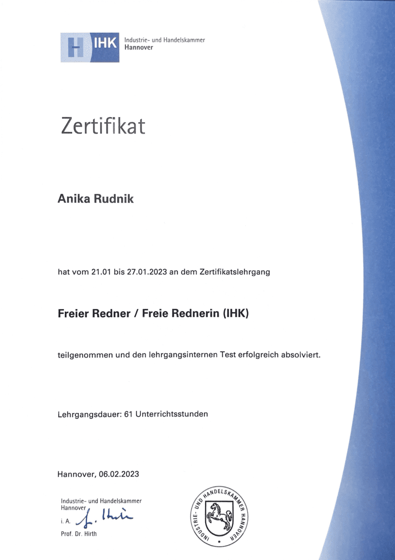 Liebe Anika, vielen Dank für die tolle Zeit mit Dir während der Ausbildung zur freien Rednerin. Ihr habt das toll gemacht und man geht Tip top vorbereitet in die neue Lebensaufgabe Bleib wie Du bist und mach weiter so, herzlichen Dank von Herzen Petra